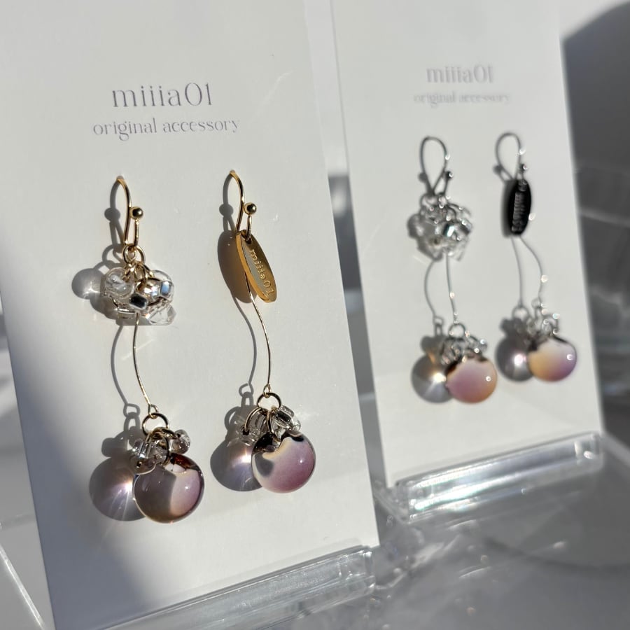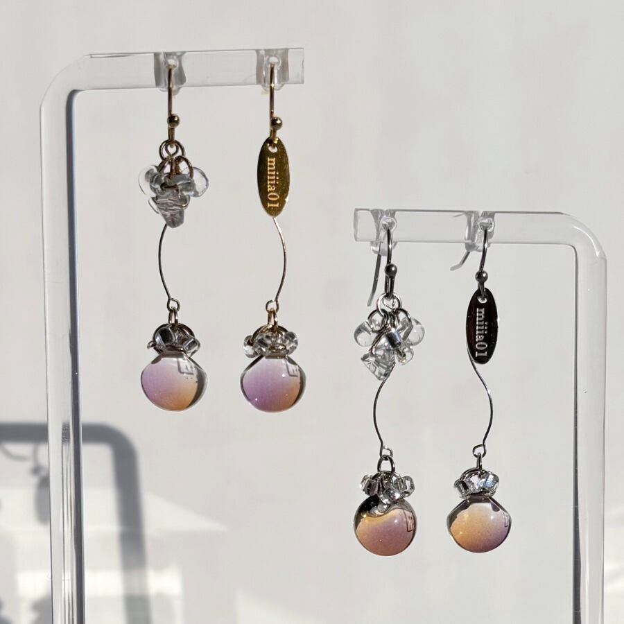 冬の静かな夕暮れと街にきらめくイルミネーションが溶け合うような透け感のあるニュアンスカラーのビーズをメインに、ガラスビビーズを合わせて、冬のきらめきをぎゅっと詰めこみました♡