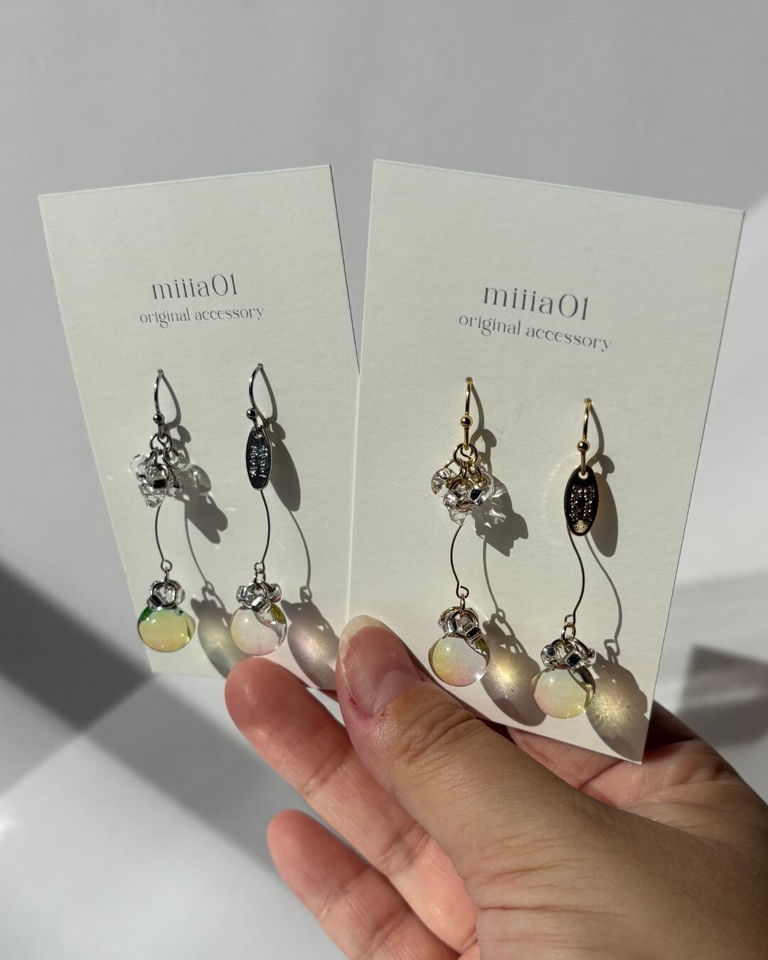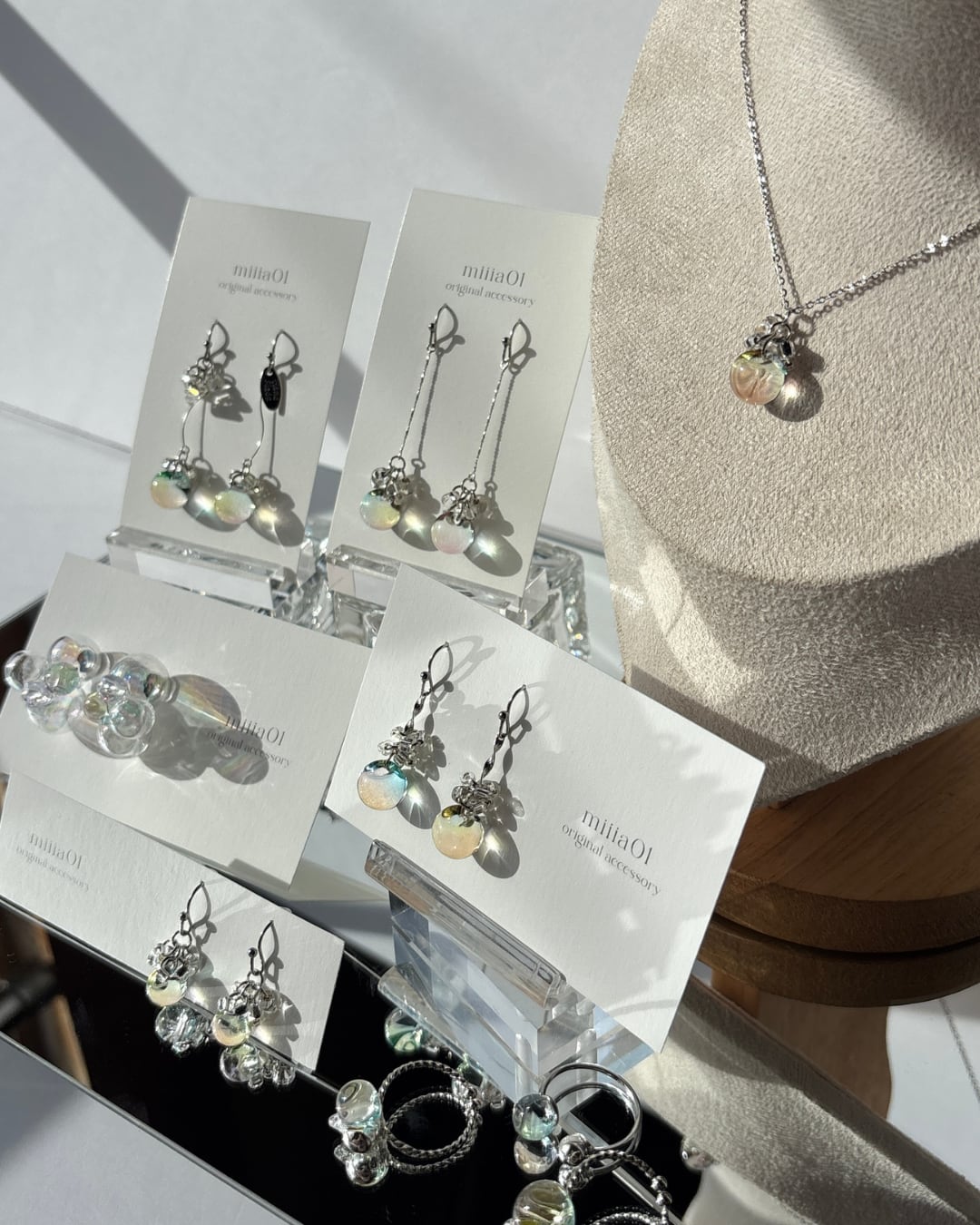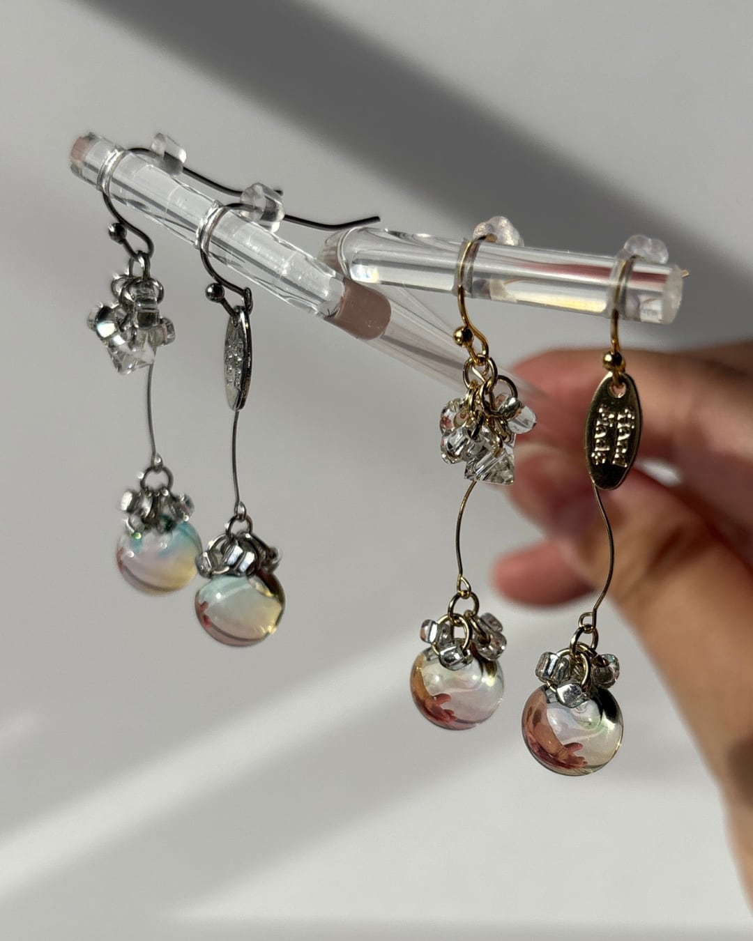 やわらかくカーブしたラインと、とろけるような春カラーのガラスビーズが組み合わさって、歩くたび視線をふわっと惹きつけてくれます!