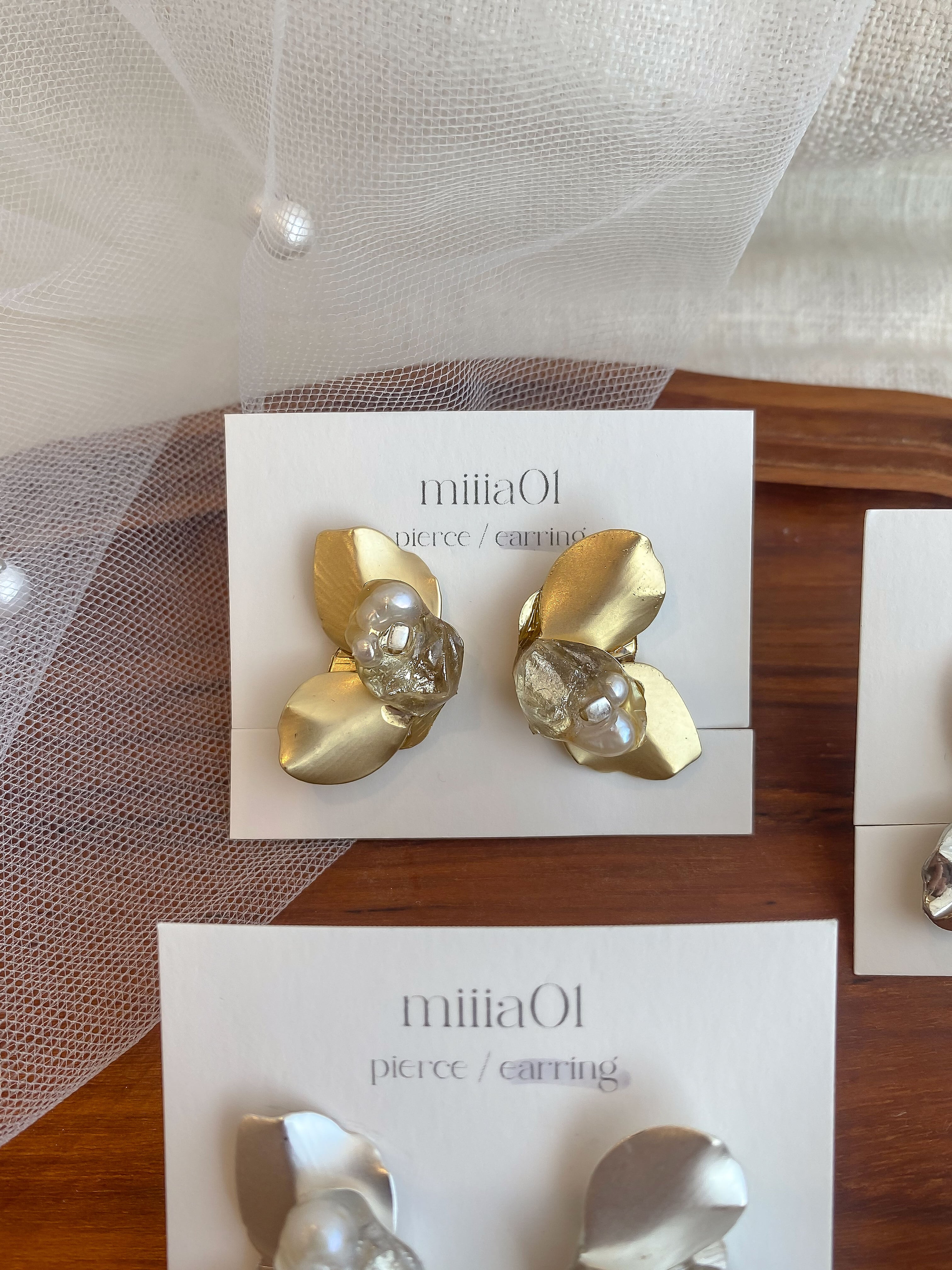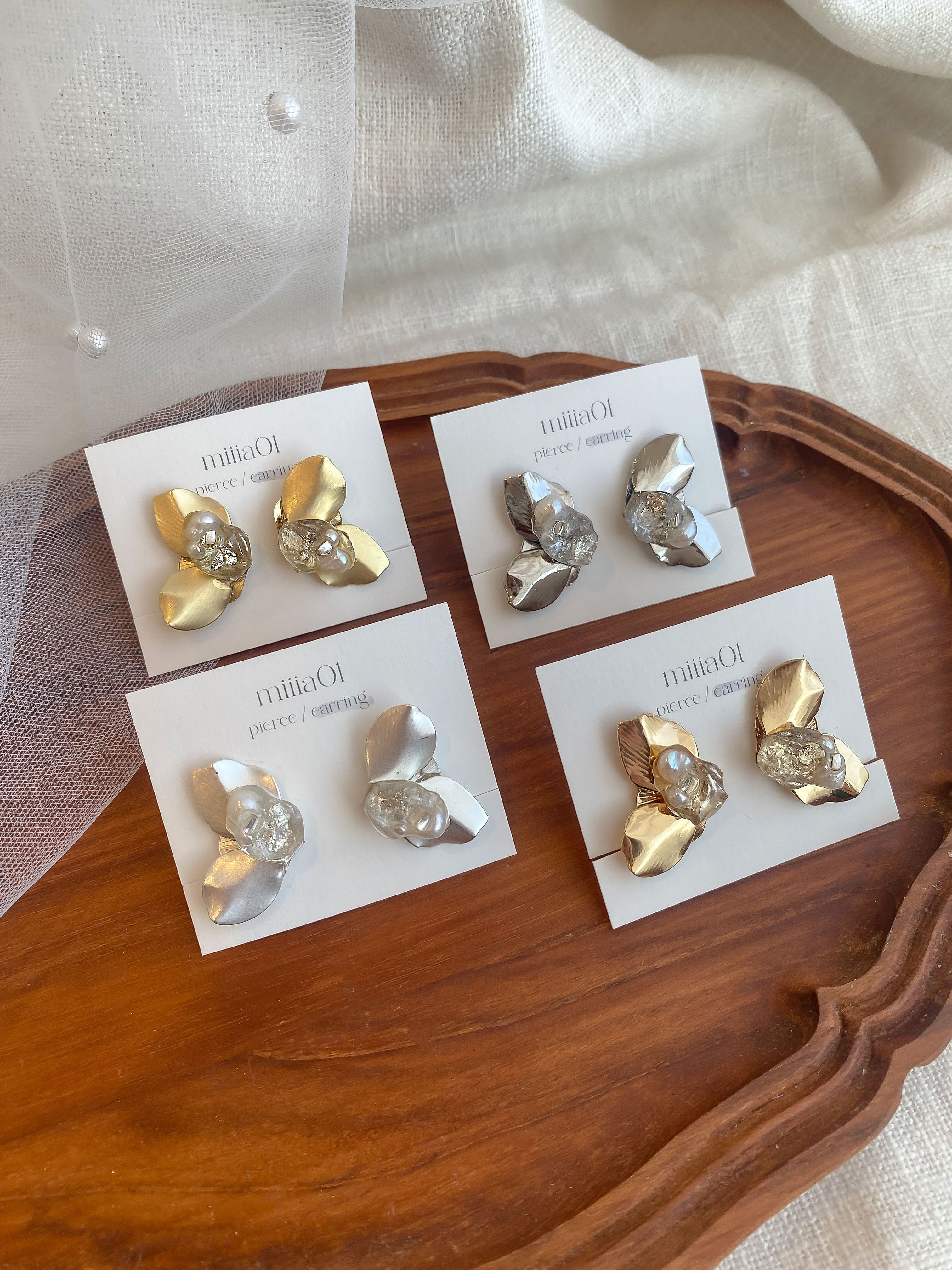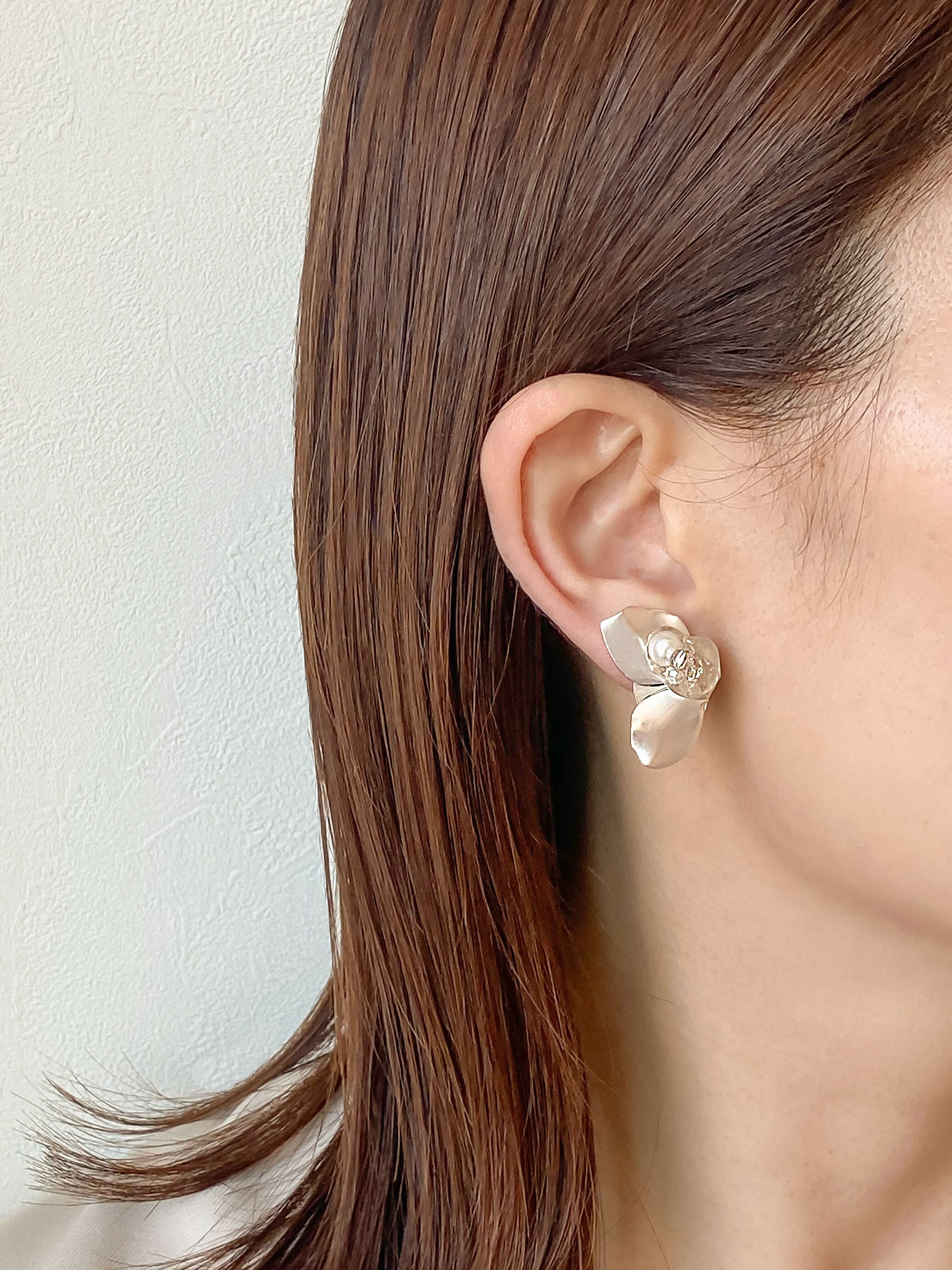 花ビラのようなゴールドのパーツを使った立体感のあるアシンメトリーアクセサリーです。