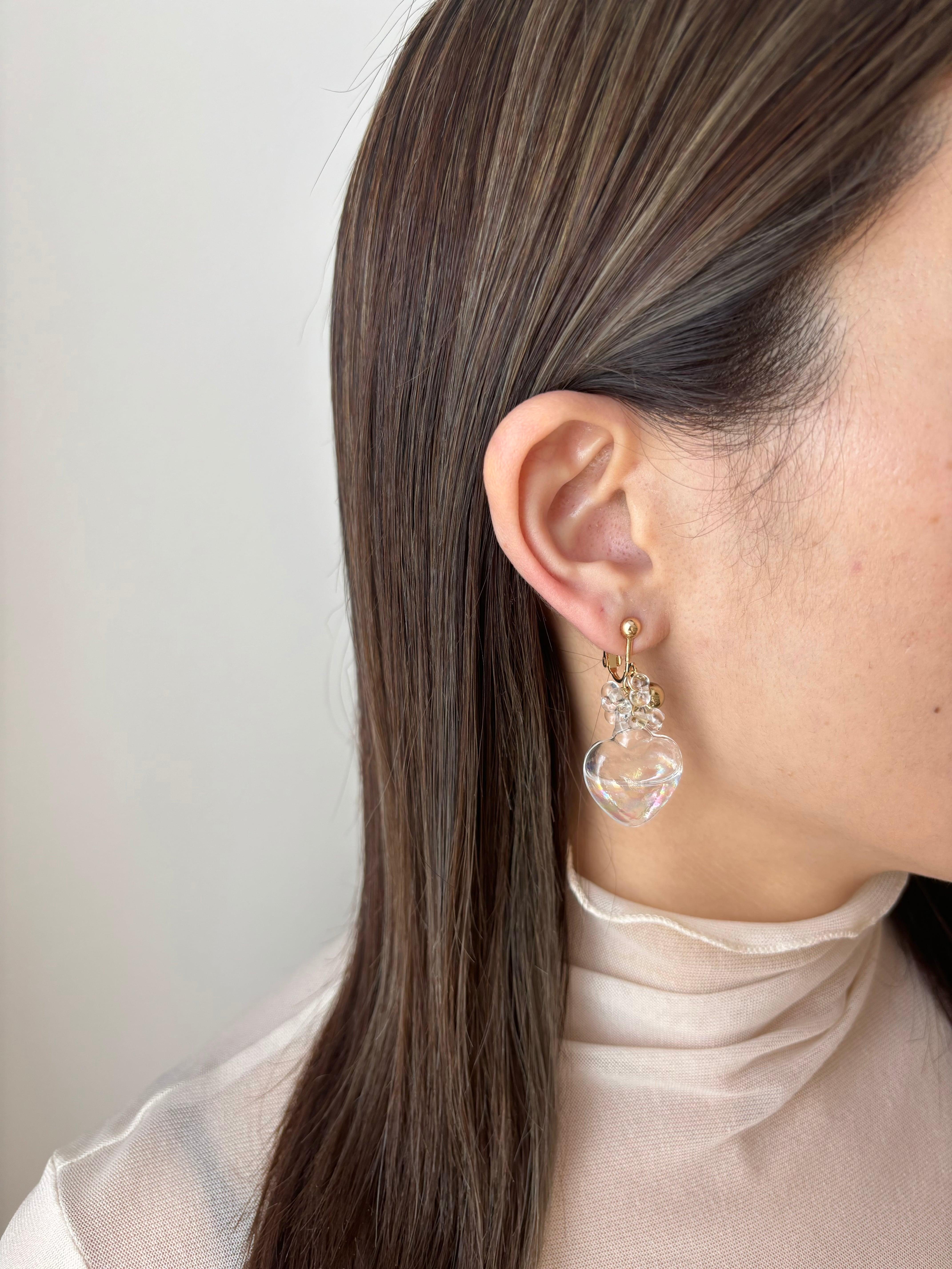 お水の入ったハートのガラスチャームとまるまるっとしたガラスのファルファーレビーズを合わせました。